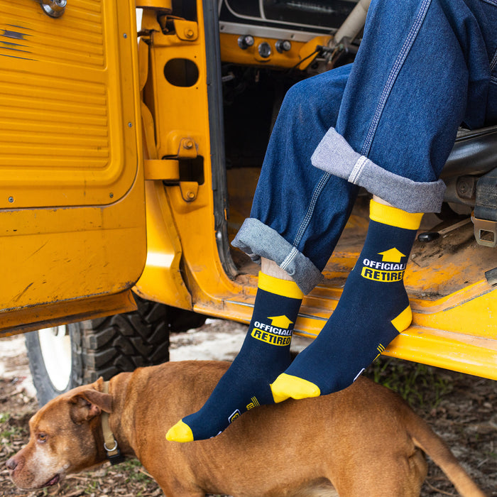 Say goodbye tension, hello pension with these super fun retirement socks! These aren't just any socks; they're your new best friends in the world of relaxation. With "Officially Retired" proudly displayed on the sides and a sneaky little secret message on the bottom that cheekily declares, "Do Not Disturb, I’m Retired," these socks are all about celebrating your newfound freedom in style.